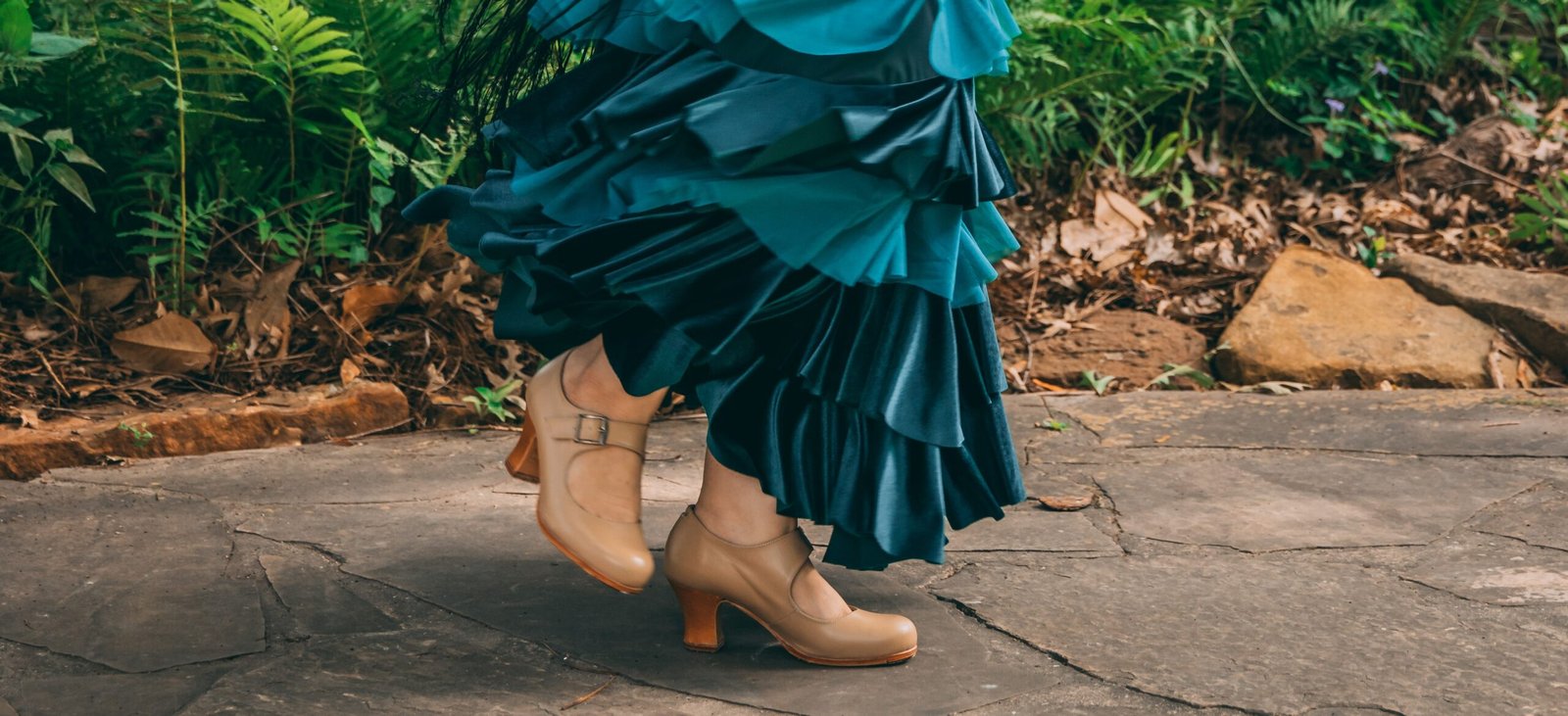 Traditional flamenco dresses hanging on display, featuring vibrant colors and ruffled layers. The dresses showcase polka dot patterns and are predominantly red, pink, and black with varying designs.
